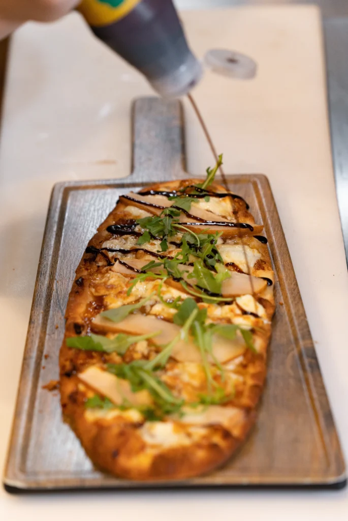 Crumbled blue cheese, fig spread, and thinly sliced pear, topped with arugula and balsamic drizzle