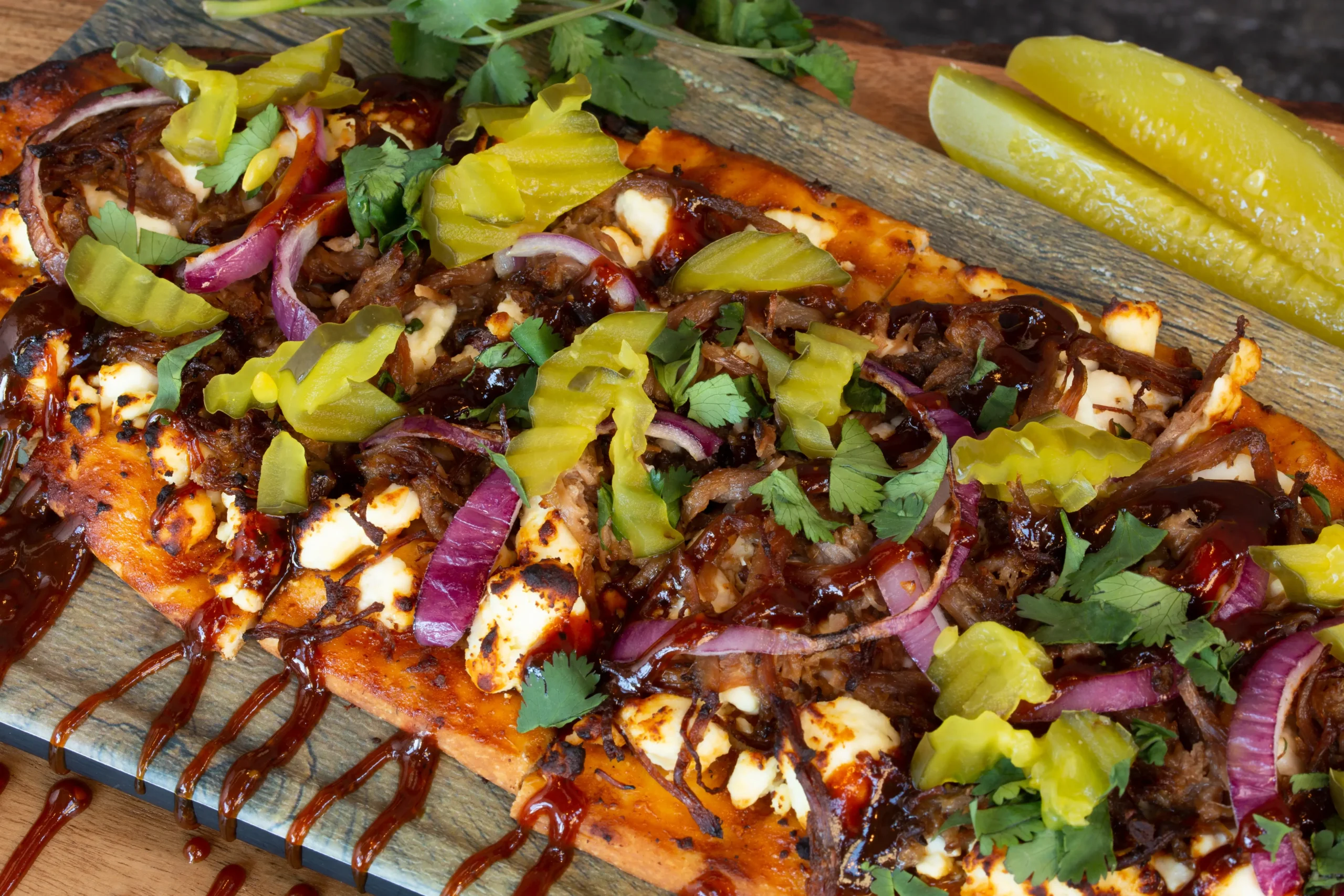 Brisket and feta topped with cilantro, red onion, and pickles, drizzled with homemade barbecue sauce